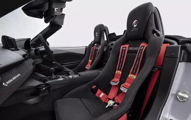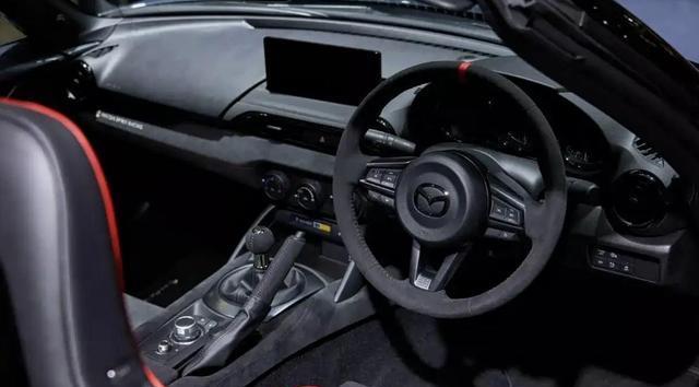 进入车内,马自达MX-5 Spirit Racing Roadster 12R采用了大面积黑灰色Alcantara面料铺陈,加入了红色的手工双缝线,随处可见的“MAZDA Spirit Racing Roadster 12R”白色刺绣,并配备了一体式桶装赛车座椅和四点式安全带设计,烘托出浓郁的赛车氛围。中控台配备了经典的小尺寸方向盘,麂皮绒材质的包裹,12点方向还加入了红色的回正皮标,操控岛区域保留了圆头手动变速箱手柄和机械式手刹,将会带来更纯粹的驾驶体验。中控台还还原了三个炮筒式仪表匹,从左往右一次是彩色液晶仪表、发动机转速指针仪表、码数指针仪表,两侧还有炮筒式空调出风口,更加有玩味。