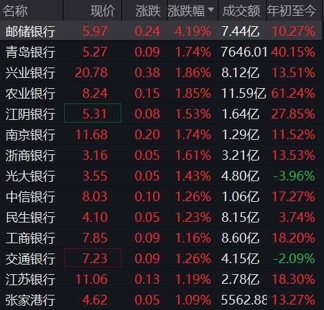早盘,银行板块盘中表现活跃,截至发稿邮储银行涨超4%,农业银行延续强势走势涨近2连阳并再创历史新高,总市值突破2.88万亿元。