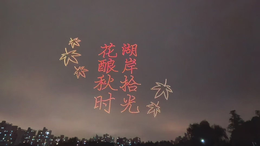 10月18日晚,在“花酿秋时・湖岸拾光”大宁公园秋季游园会现场,一场“科技惊喜”擦亮了大宁功能区的夜空。大宁湖上空,千架无人机编队次第升空,在夜色中勾勒出璀璨灵动的图案,与湖畔的露天光影活动形成了陆空呼应的双重震撼。