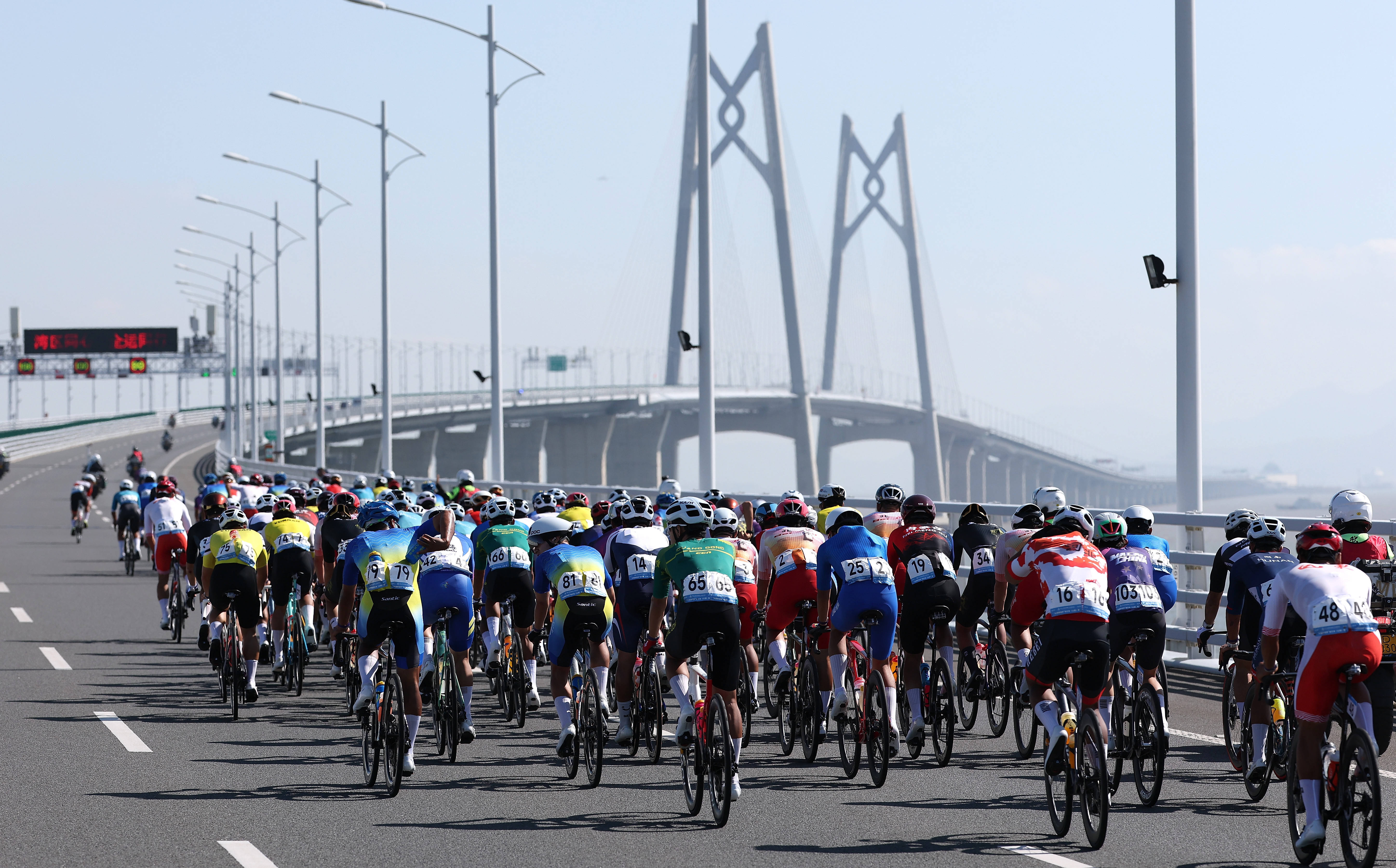 11月8日,参赛选手在港珠澳大桥骑行。当日进行的第十五届全国运动会公路自行车男子个人赛,赛道全程231.8公里,选手经过港珠澳大桥,跨越粤港澳三地。这是全运会历史上首次举办跨境比赛。新华社记者 毛思倩 摄——全运会之“全”,在于内涵,在于价值,更在于对全民共享理念的追求。